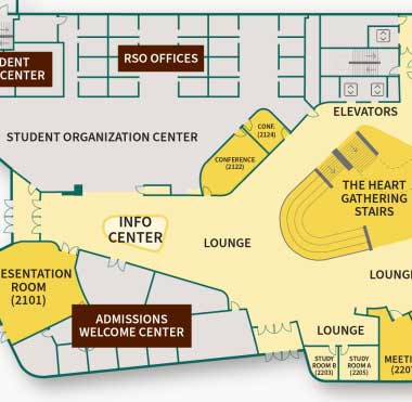 The meeting area is the Student Organization Center (SOC) and is located on the second floor of the building.